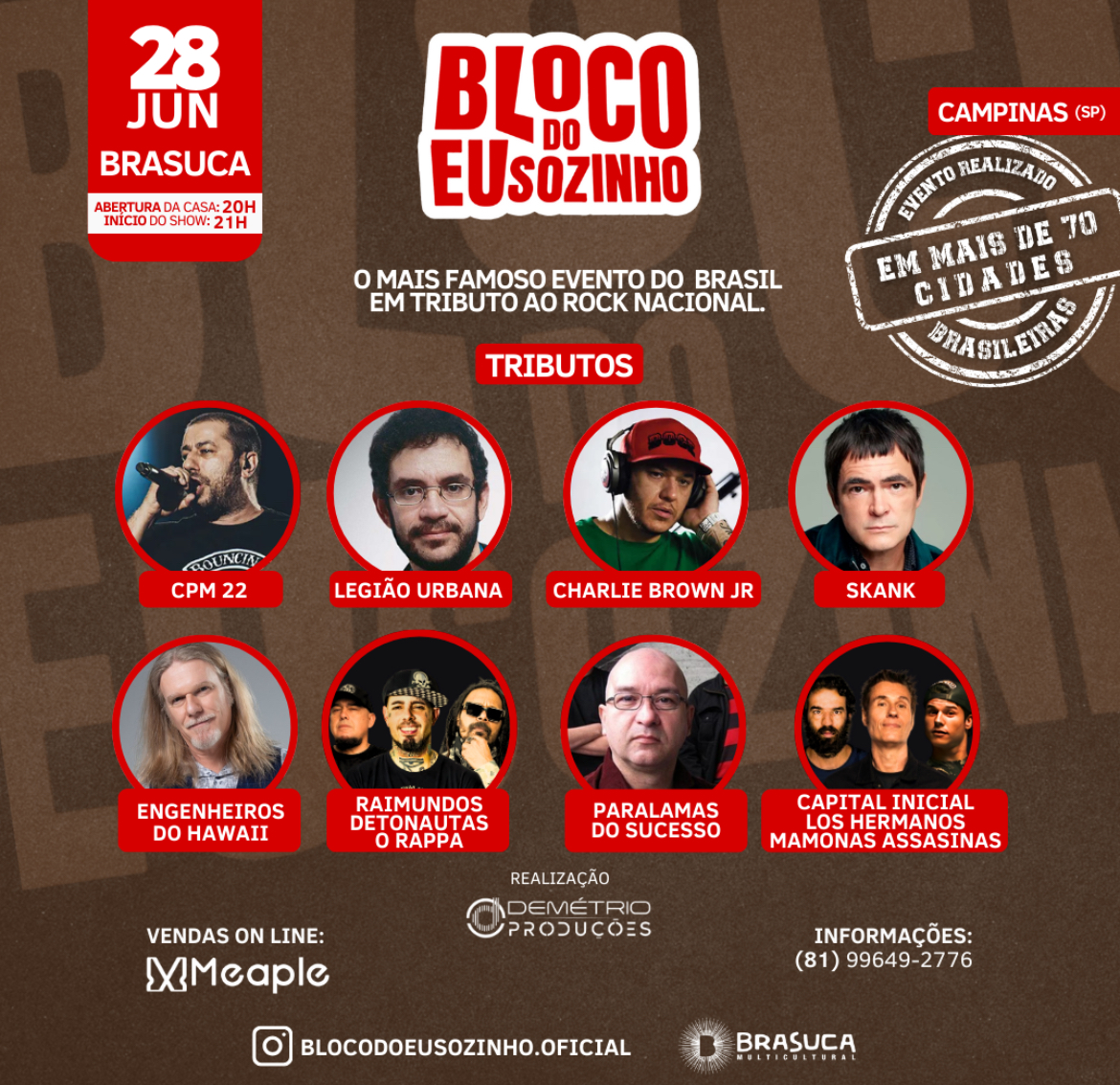 O Brasuca será palco de uma verdadeira celebração ao rock nacional em junho. O Bloco do Eu Sozinho chega a Campinas para uma apresentação inédita e escolheu o Brasuca Multicultural, em Barão Geraldo, para uma noite especial de homenagem a grandes bandas brasileiras com canções que marcaram época. Este show faz parte da turnê comemorativa dos nove anos do projeto, que celebra o melhor do rock nacional. O show acontece no dia 28 de junho, com ingressos à venda no site.