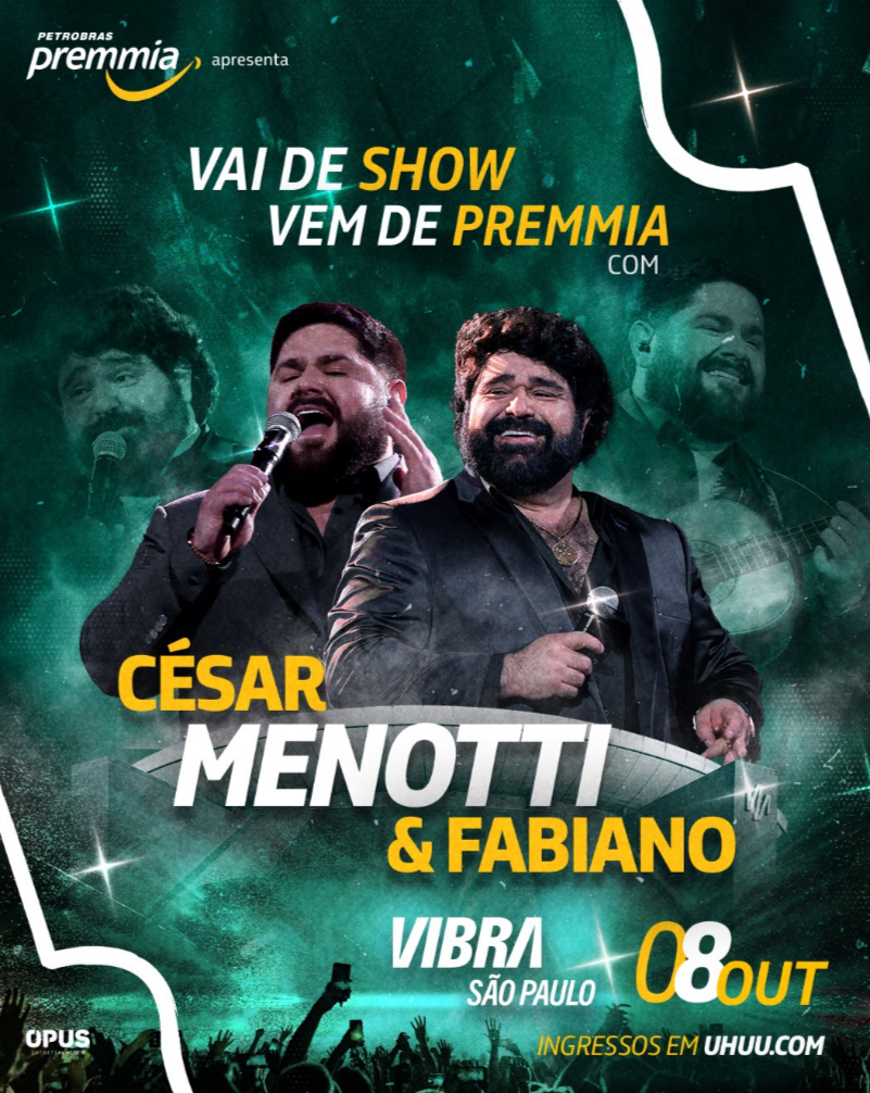 Considerados os grandes precursores do “Sertanejo Universitário”, movimento que há duas décadas aproximou novamente o público jovem do gênero, César Menotti & Fabiano seguem conquistando plateias por todo o Brasil. Após o lançamento da Intensidade Tour em Jaguariúna, no interior paulista, a dupla já tem encontro marcado com os fãs da capital: dia 8 de outubro, na Vibra São Paulo. Ingressos à venda pelo app Premmia, pelo site Vibrasaoaulo.com.br e pontos autorizados Reconhecendo essa trajetória de sucessos e a expectativa do público, o Premmia, programa de fidelidade dos Postos Petrobras, traz os irmãos para São Paulo em um evento que promete ir além do show: uma experiência completa e inesquecível para os fãs.