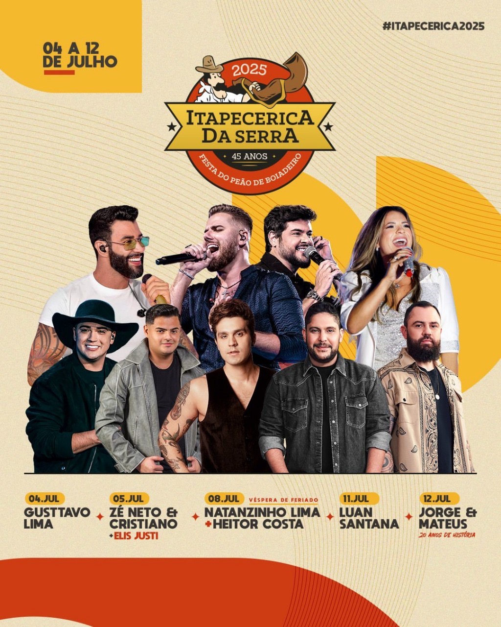 No sábado (05), a festa continua e quem sobe ao palco é a dupla Zé Neto & Cristiano e a cantora Elis Justi. O segundo final de semana tem a apresentação de Natanzinho Lima e Heitor Costa no dia 08 (véspera de feriado). No dia 11, é a vez do cantor Luan Santana realizar um grande show. E no dia 12 de julho, Jorge & Mateus apresentam a turnê “20 anos de história”, encerrando o evento com grande estilo.