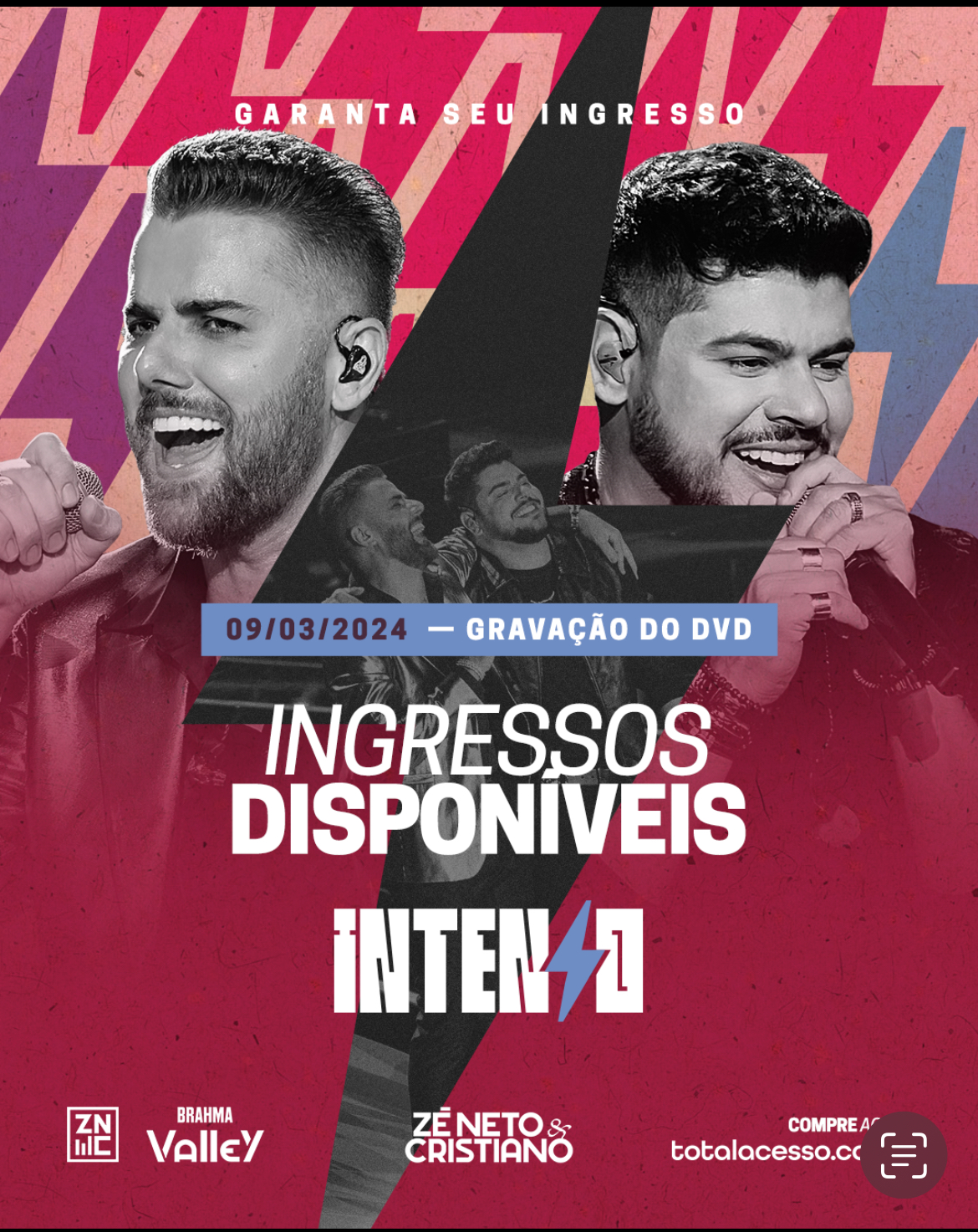 Os ingressos já estão disponíveis através do site: https://www.totalacesso.com/events/gravacaodvdzenetocristiano. “Intenso” é o segundo projeto após Zé Neto & Cristiano assumirem a própria carreira, no início de 2023 a dupla gravou o DVD “Escolhas” em São Paulo, com ingressos esgotados, o projeto se concretizou como o álbum mais ouvido nas rádios e do Spotify Brasil em 2023, para se ter ideia do tamanho sucesso são mais de 647 milhões de players em apenas quatro faixas na principal plataforma áudio.