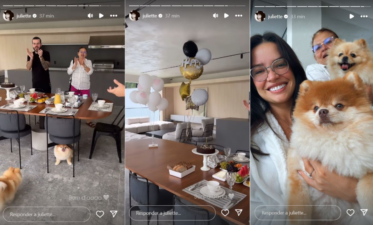 Por meio de seus stories no Instagram, Juliette mostrou detalhes da primeira celebração do dia, que contou com um verdadeiro banquete recheado de frutas, pães, sucos e um bolinho de chocolate. A mesa ainda ganhou uma decoração com diversos balões, que deixaram o ambiente ainda mais agradável.