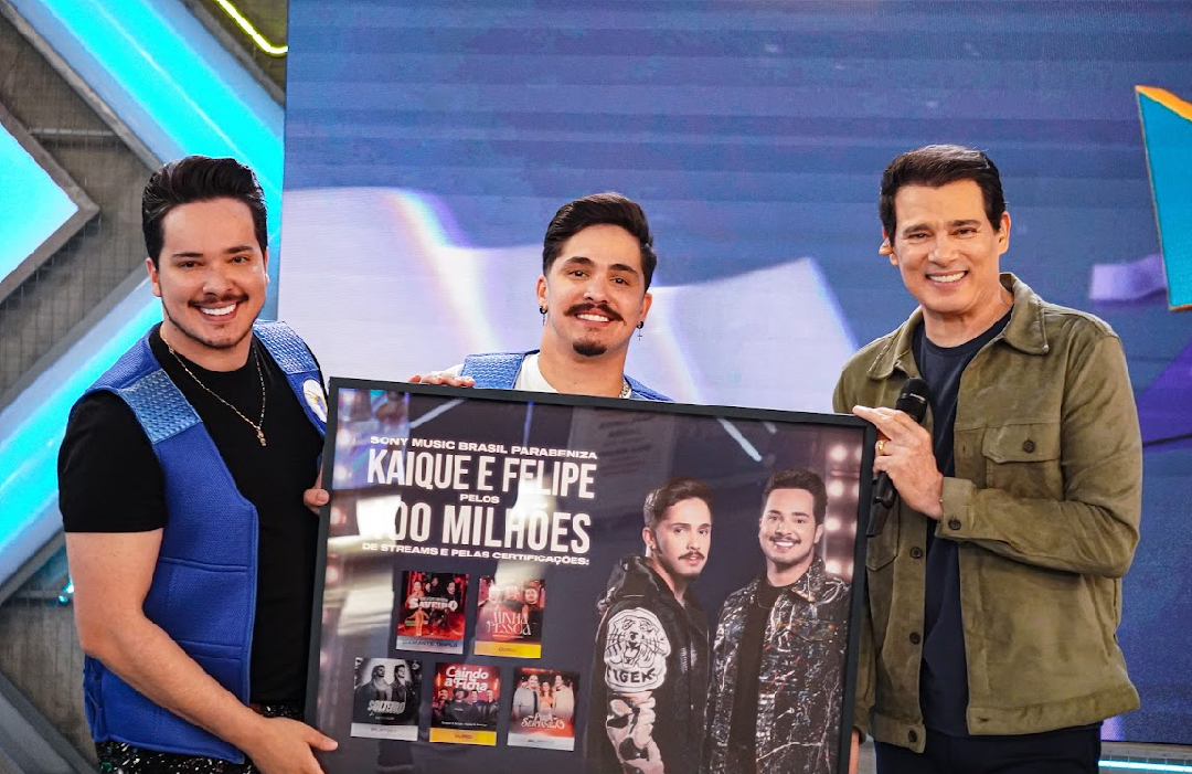 Kaique e Felipe são surpreendidos no palco do Domingo Legal e brilham no sertanejo