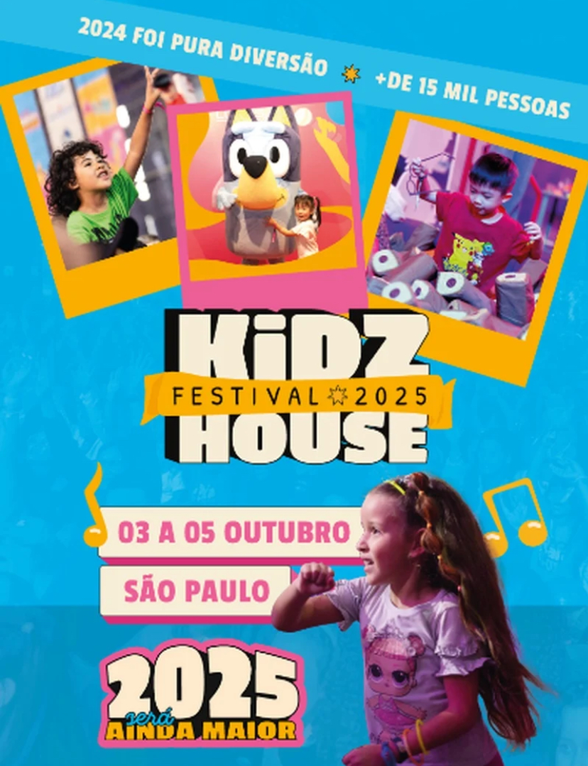Prepare-se, São Paulo! Depois de conquistar mais de 15 mil pessoas em sua primeira edição, o festival chega ainda maior: 3 dias de programação, 5 sessões temáticas e mais de 20 horas de experiências imersivas, com música, fantasia, brincadeiras, shows e surpresas para todas as idades. Estamos falando do Kidzhouse Festival 2025, que promete uma verdadeira maratona de entretenimento nos dias 3, 4 e 5 de outubro, na ARCA, em São Paulo, com ingressos já disponíveis no site: https://ingresse.com/kidz-house-festival-2025-sao-paulo/
