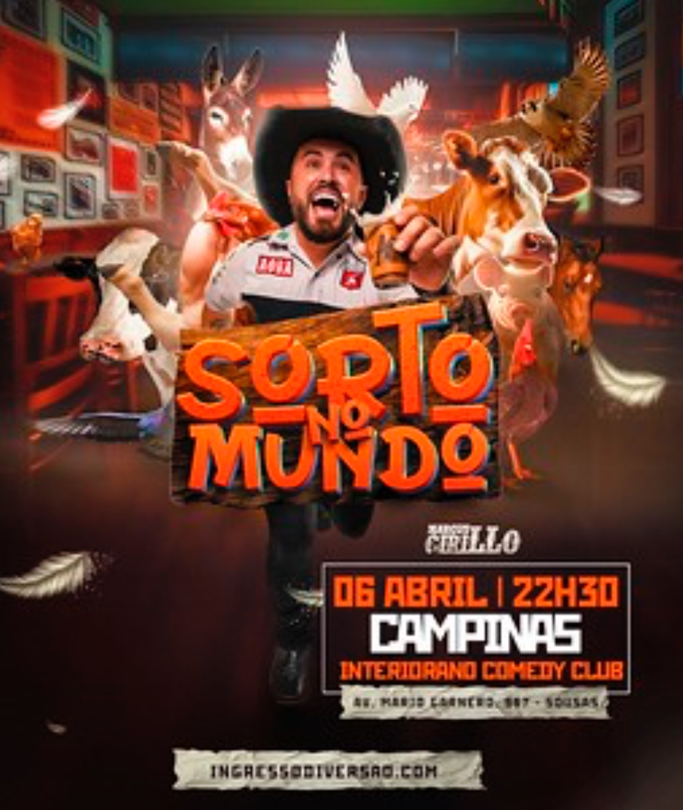 O novo show de stand-up “Sorto no Mundo” de Marcus Cirillo é uma oportunidade única de mergulhar em um oceano de risadas e entretenimento. Não perca a chance de testemunhar o talento deste mestre da comédia ao vivo. O show será realizado no dia: 06 de abril de 2024 (Sábado)