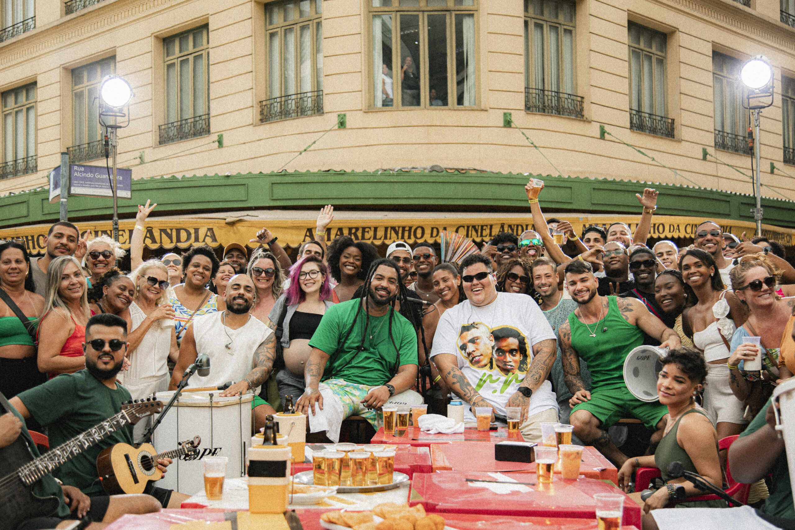 A apresentação, filmada em frente ao Amarelinho, um tradicional bar carioca, reuniu uma multidão e transformou o centro da cidade em um verdadeiro palco a céu aberto, resultando em um registro autêntico e repleto de energia.
