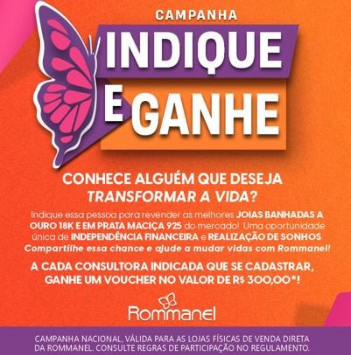 A Rommanel, marca 100% brasileira referência em joias banhadas a Ouro 18k e em Prata Maciça 925, anuncia o lançamento de sua nova campanha nacional voltada para a captação de revendedoras. Sob o lema “Conhece alguém que deseja transformar a vida?”, a ação convida o público a indicar pessoas interessadas em empreender com a marca. A campanha é válida exclusivamente para as lojas físicas de venda direta da Rommanel em todo o Brasil.