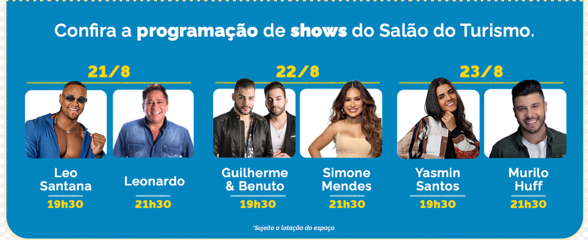 O Salão do Turismo do Brasil, promovido pelo Ministério do Turismo, será realizado de 21 a 23 de agosto, no Distrito Anhembi, em São Paulo, com entrada gratuita. Para este ano, além da programação habitual, com gastronomia e destinos turísticos, o evento promete atrações musicais. Na quinta-feira (21), o público vai curtir a energia contagiante de Léo Santana e do sertanejo clássico de Leonardo. Na sexta-feira (22), Guilherme & Benuto e Simone Mendes entram à grade da noite com um verdadeiro espetáculo com seus maiores hits. No sábado (23), para encerrar o evento com chave de ouro, o palco ficará por conta da voz marcante de Yasmin Santos e do romantismo de Murilo Huff.