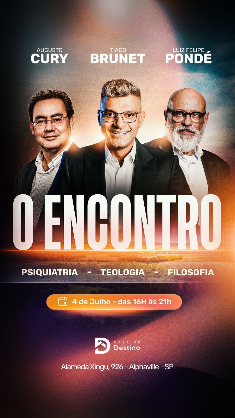 Nesta sexta-feira, 04 de julho, das 16h às 21h, a Casa de Destino, em Alphaville/SP, será palco de uma experiência transformadora: “O Encontro”, idealizado por Tiago Brunet. Ao lado do psiquiatra Augusto Cury e do filósofo Luiz Felipe Pondé, Brunet conduz uma imersão que promete virar a chave na vida dos participantes, com uma jornada intensa entre psiquiatria, teologia e filosofia.