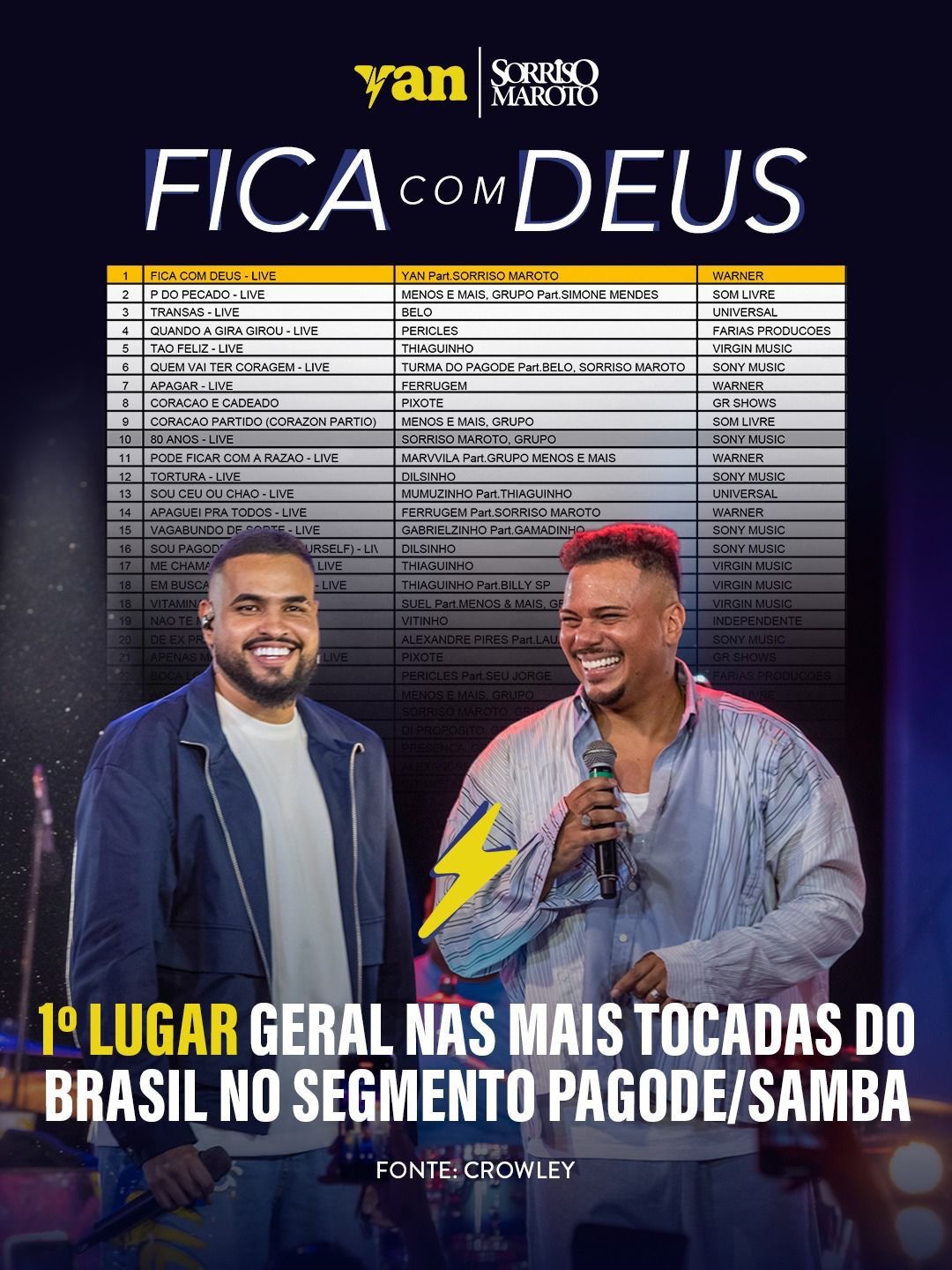 A nova geração do pagode tem um nome em destaque: Yan. O cantor, que vem conquistando o público apaixonado pelo ritmo, acaba de alcançar um marco expressivo. De acordo com a _Crowley_, empresa referência no monitoramento de execuções musicais no Brasil, _“Fica com Deus”_, sua parceria com o Sorriso Maroto, é a música mais tocada do país no segmento pagode/samba, ocupando o topo das rádios de norte a sul.