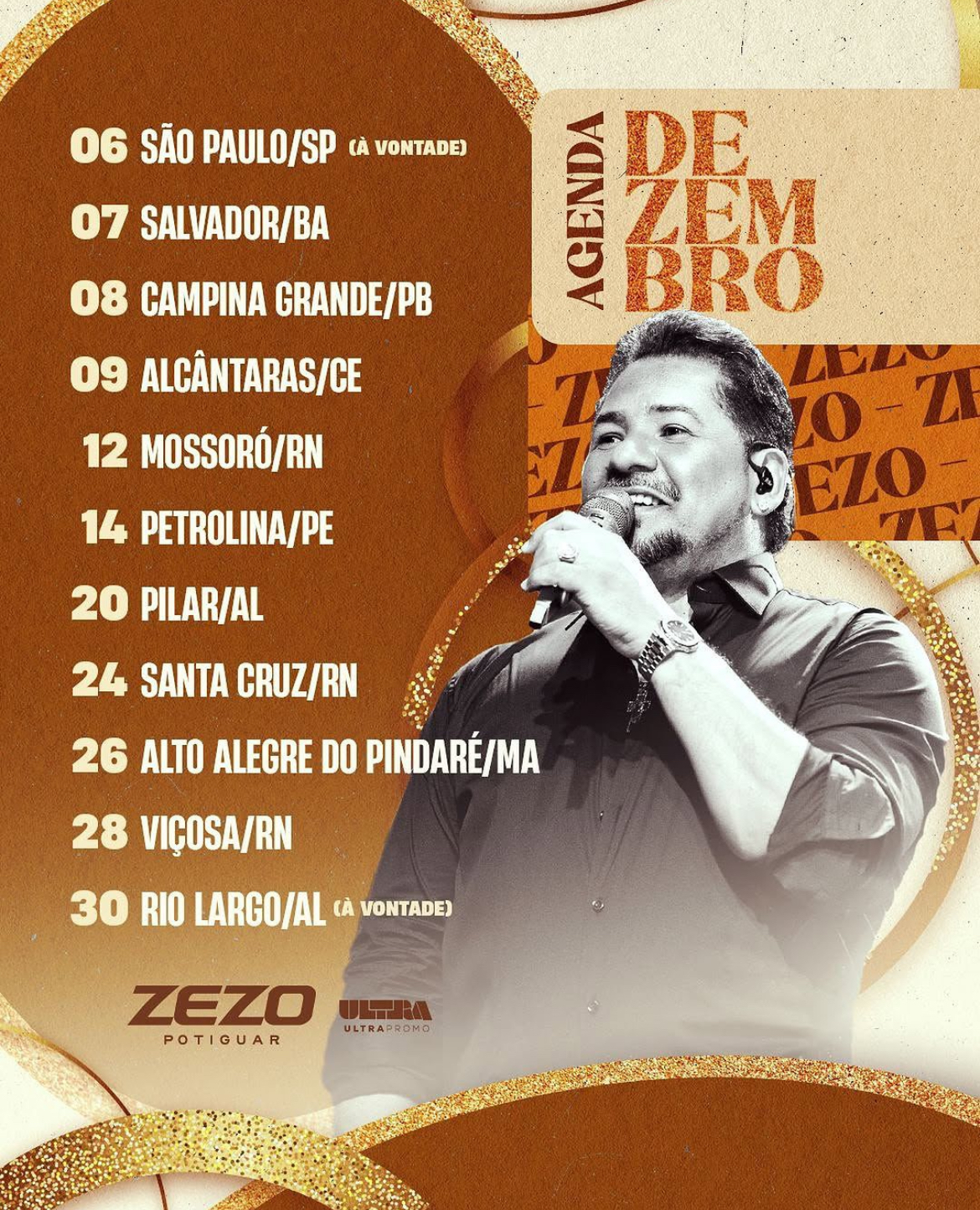 A partir deste sábado (14), Zezo inicia a sequência final do mês em Petrolina (PE), seguida por Pilar (AL) no dia 20. No clima natalino, ele marca presença em Santa Cruz (RN) no dia 24, celebrando com os fãs na véspera de Natal. Já nos dias 26 e 28, Zezo segue para Alto Alegre do Pindaré (MA) e Viçosa (RN), respectivamente, mantendo seu compromisso de emocionar o público por onde passa.